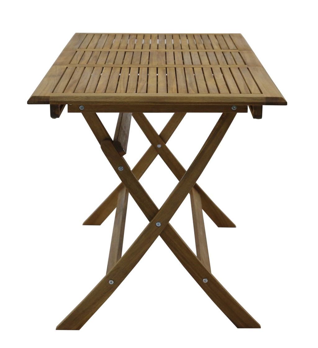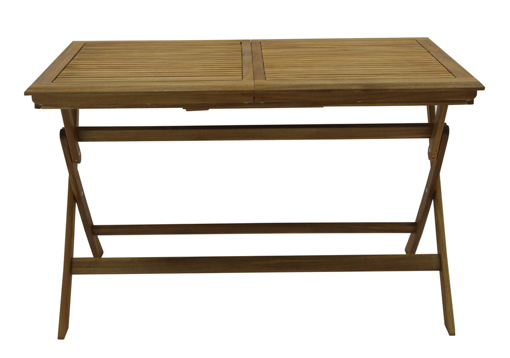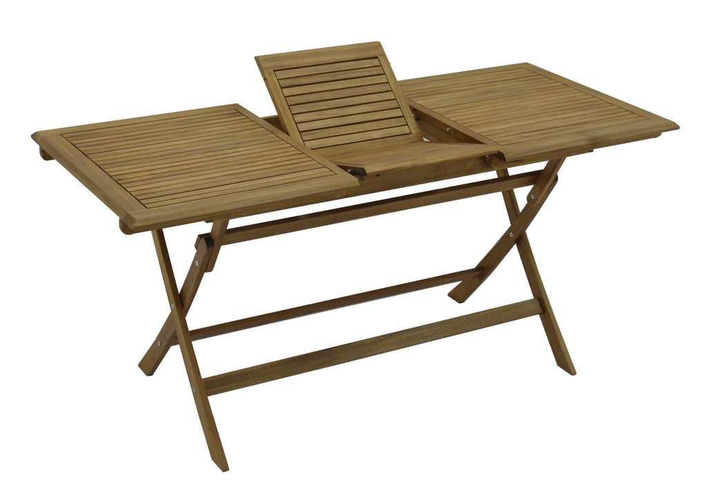 Tavolo rettangolare pieghevole in legno di acacia con estensione, con piano a listelli e con bordi arrotondati. Ideale per l'arredo del giardino o su terrazze all'insegna della naturalità del legno di acacia con tinte calde.