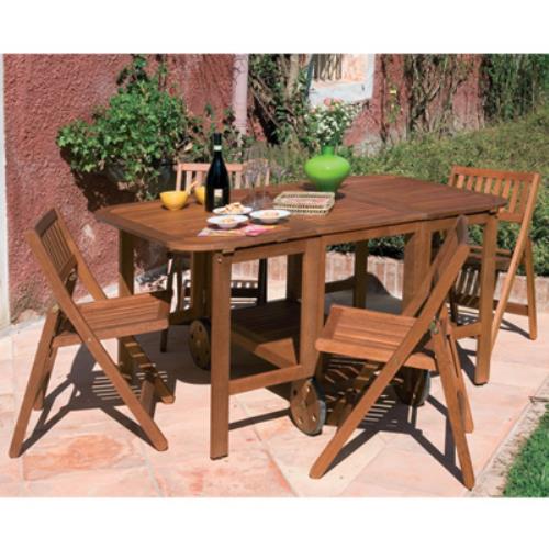 Tavolo 150x90x70h cm con 4 sedie, richiudibile e salvaspazio per giardino. In legno Keruing, finitura a olio, ingombro chiuso 50x90x74h cm.
