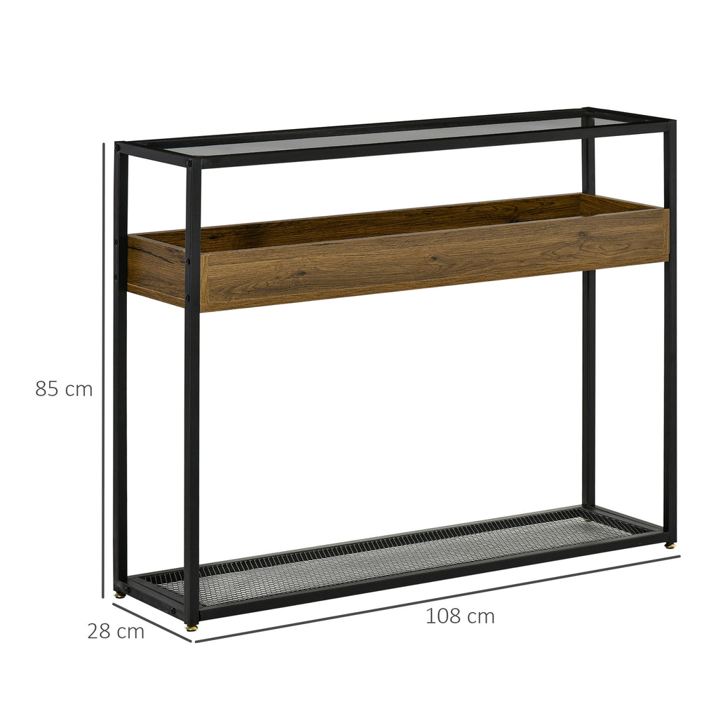 Rinnova i tuoi spazi di casa con il tavolo consolle . Le linee semplici in stile industriale portano un tocco trendy facile da abbinare a tanti tipi di arredo. Il piano d'appoggio in vetro è elegante e facile da pulire, mentre la mensola centrale con bordi alti e il ripiano inferiore ti offrono tanto spazio per riporre i tuoi oggetti in modo ordinato. Il design compatto ti permette di usarla ovunque vuoi, come consolle da ingresso, tavolino da salotto e molto altro!
