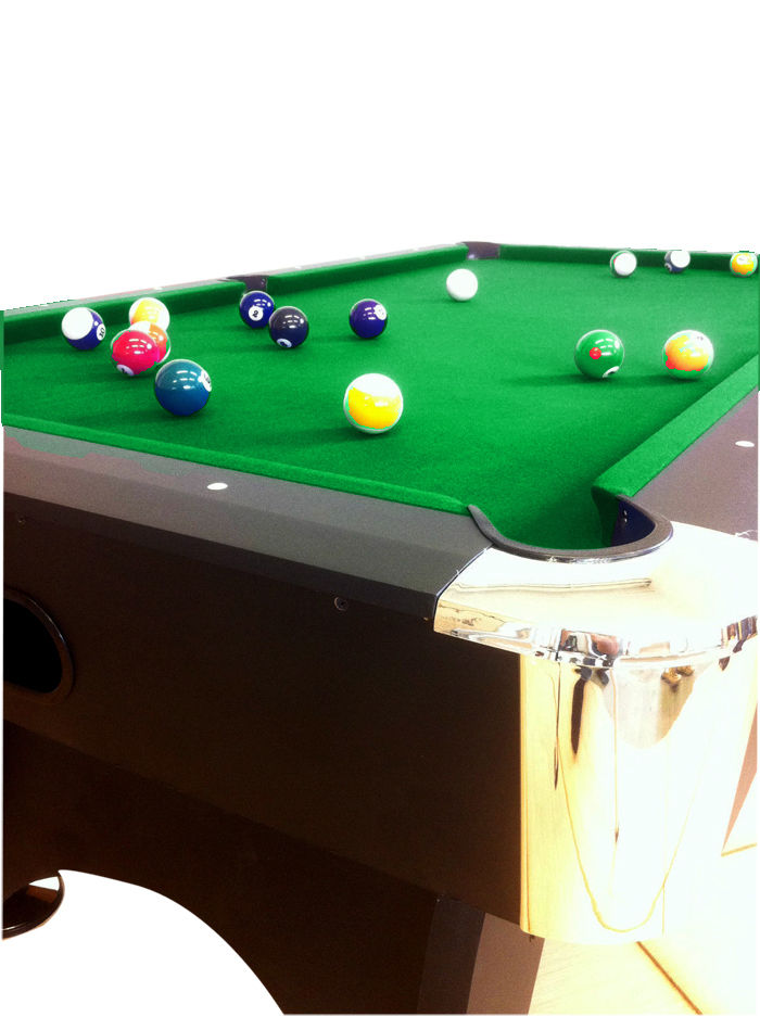 Tavolo da biliardo professionale colore nero, con panno di colore verde e inserti cromati ai quattro angoli. Ideale per divertirsi con gli amici nelle serate in compagnia.