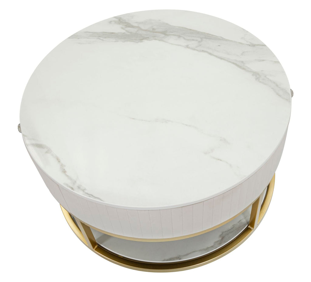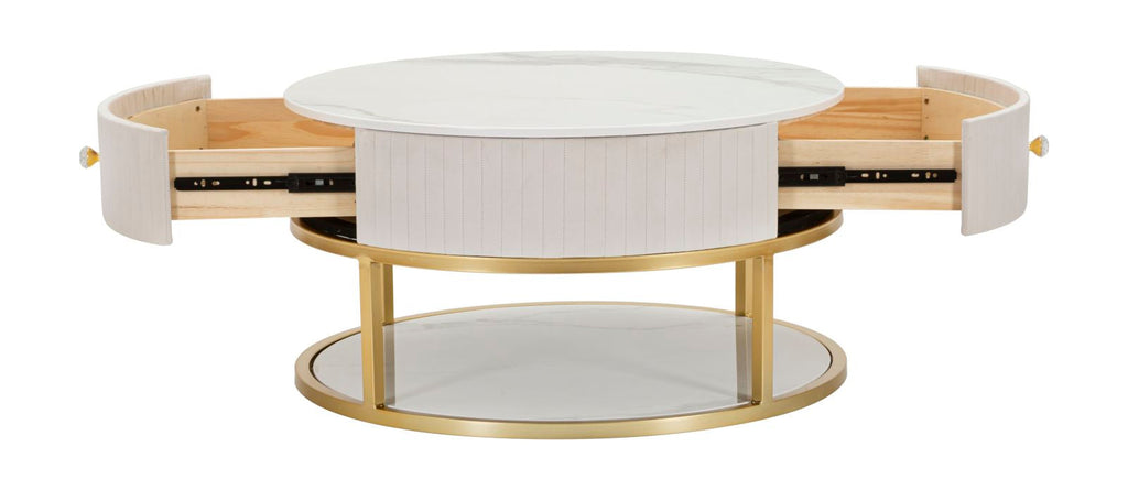 Il tavolo da caffè rotondo presenta una stuttura elegante in metallo dorato, che conferisce un tocco di raffinatezza. Il top e il ripiano in simil marmo aggiungono un elemento di classe e di eleganza al design complessivo. La presenza di un cassetto permette di conservare oggetti di piccole dimensioni in maniera pratica e discreta. La parte superiore rivestita in tessuto imbottito color crema completa l'aspetto sofisticato del tavolo, rendendolo perfetto per essere abbinato a qualsiasi stile di arredamento.