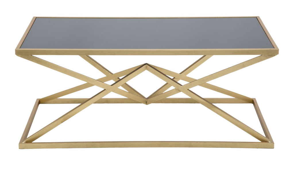 Tavolo da caffé rettangolare in metallo dorato e vetro temprato nero dalle linee geometriche e ipnotiche. Il dorato abbinato al nero crea un forte impatto. Un elemento lussuoso e glam per la tua casa. Elementi d'arredo che ricordano i lussuosi ambienti dell'Hotel Plaza di New York. Ricrea l'atmosfera magica del Grande Gatsby nel tuo interior.