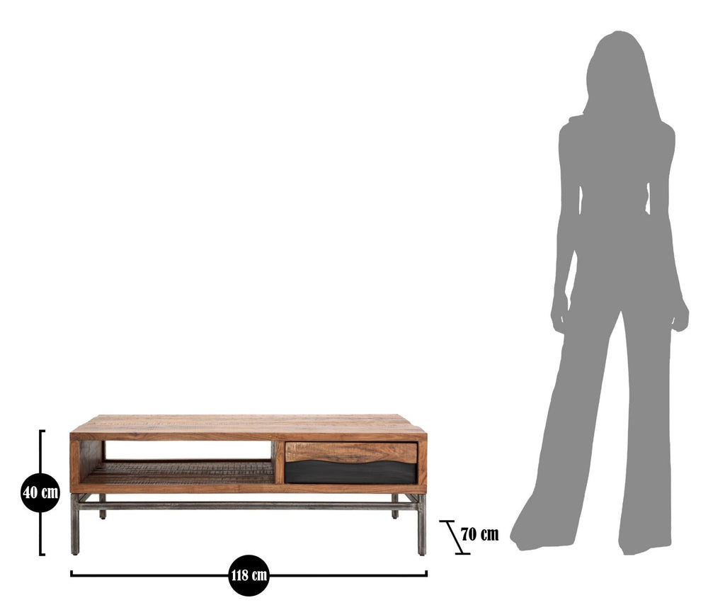 Tavolo da caffé rettangolare in legno massello di acacia con cassetto e ripiano. Il particolare design ondulato unitamente alle gambe in metallo nero creano un design originale ed elegante ad un pezzo comunque estremamente classico.