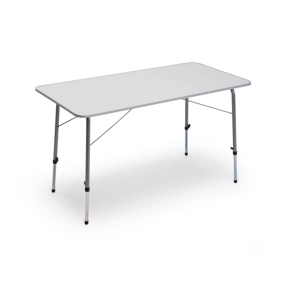 Tavolo rettangolare con gambe chiudibili e regolabili in altezza, struttura in Ferro verniciata a polvere colore grigio, piano dappoggio in MDF colore bianco, cm 120 x 60 X h 50/69Tavolo da Campeggio in MDF con Gambe Regolabili e Pieghevoli Taddei Camp 120
