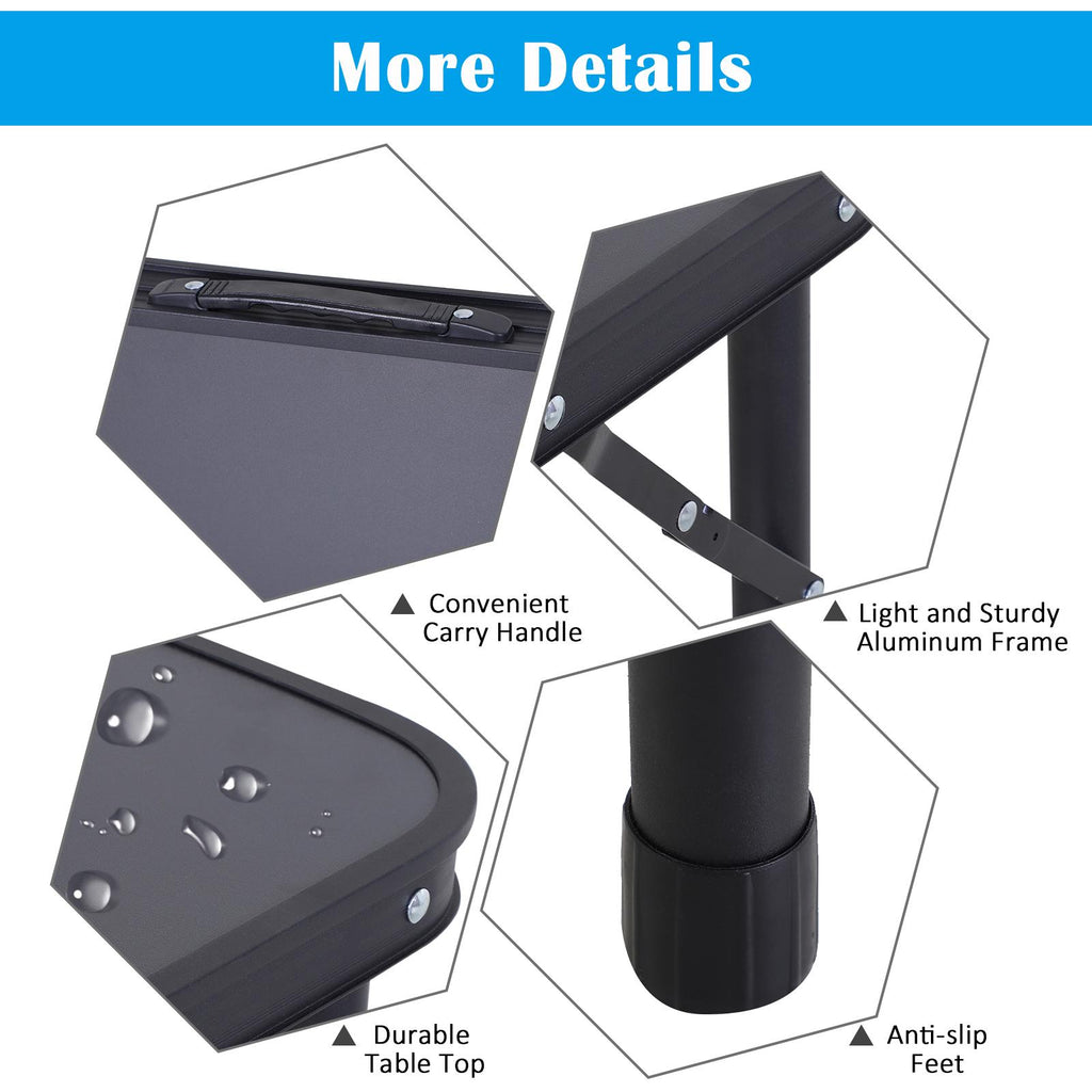 Non importa quale sia la tua destinazione, il nostro tavolo pieghevole e regolabile verrà con te! Le sue dimensioni compatte e la funzione richiudibile ti permettono di trasportarlo comodamente da una destinazione all'altra grazie all'apposita maniglia. Facile da aprire, può essere regolato su 2 livelli di altezza ed è perfetto per il campeggio, picninc ed eventi all'aperto.