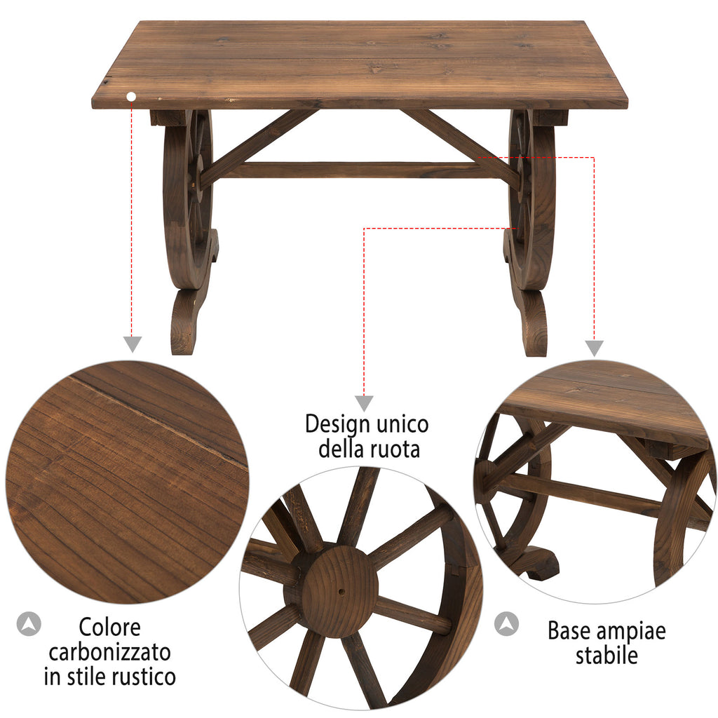 ti propone questo originale tavolo da giardino in legno di abete dallo stile country per ravvivare i tuoi ambienti. Resiste alle intemperie, alla deformazione e alla screpolatura. Puoi usarlo come tavolino da caffè o per un pranzo all'aperto in compagnia. Le gambe con forma a ruota e il legno dall'effetto carbonizzato portano un tocco di originalità al tuo arredamento da giardino. Facile da montare e dotato degli accessori per il montaggio.