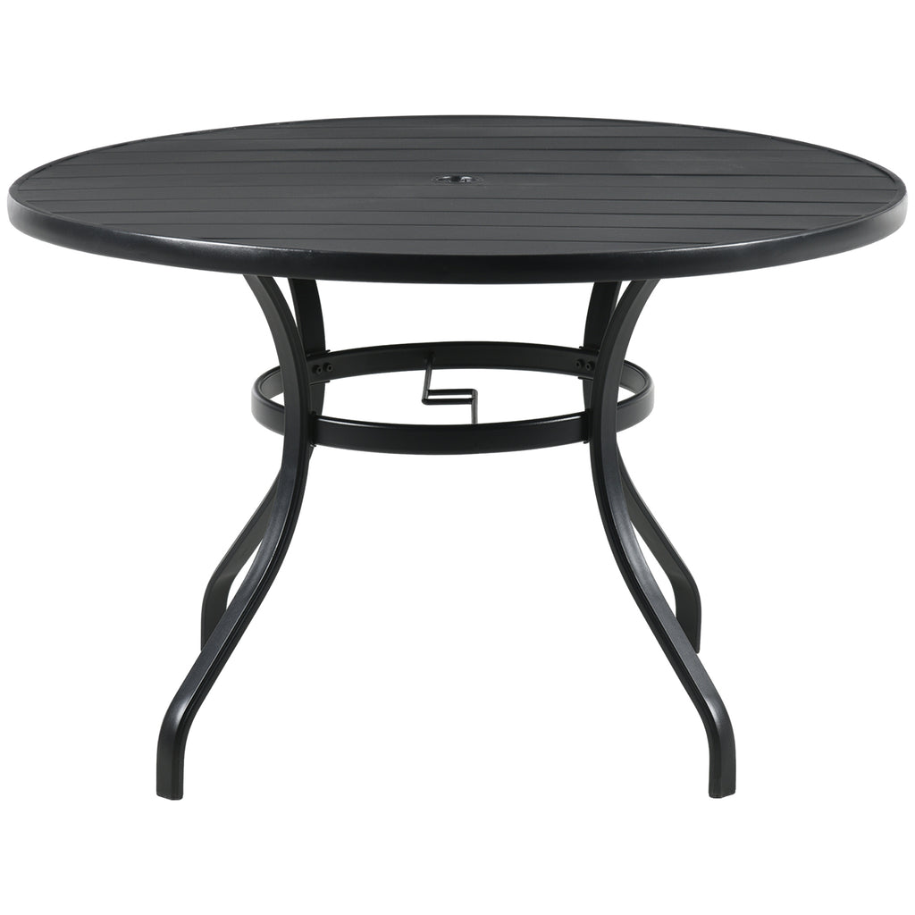 Tavolo da Giardino Rotondo per 4 Persone Ø115x72cm con Foro per Ombrellone e Doghe in Metallo Nero