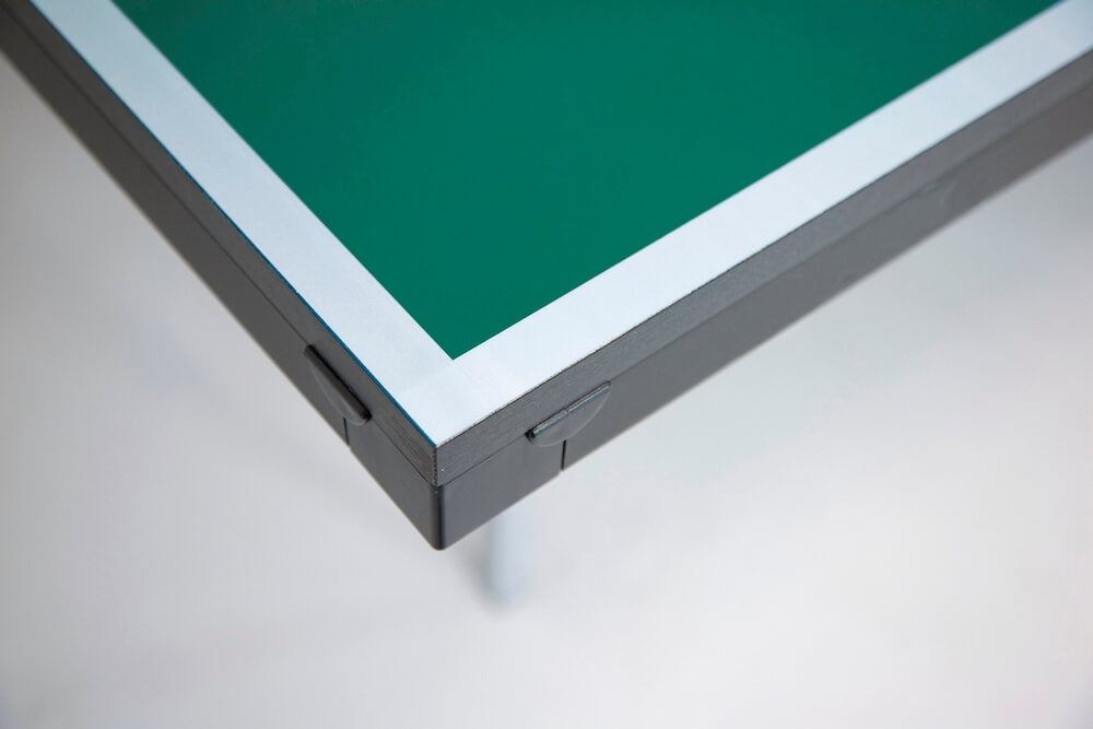 Modello per interno, pieghevole con chiusura automatica compatta, disponibile con piano gioco Verde, misure regolamentari da torneo (cm. 274x152,5x76), ideale per luso ricreativo intensivo e per lallenamento.