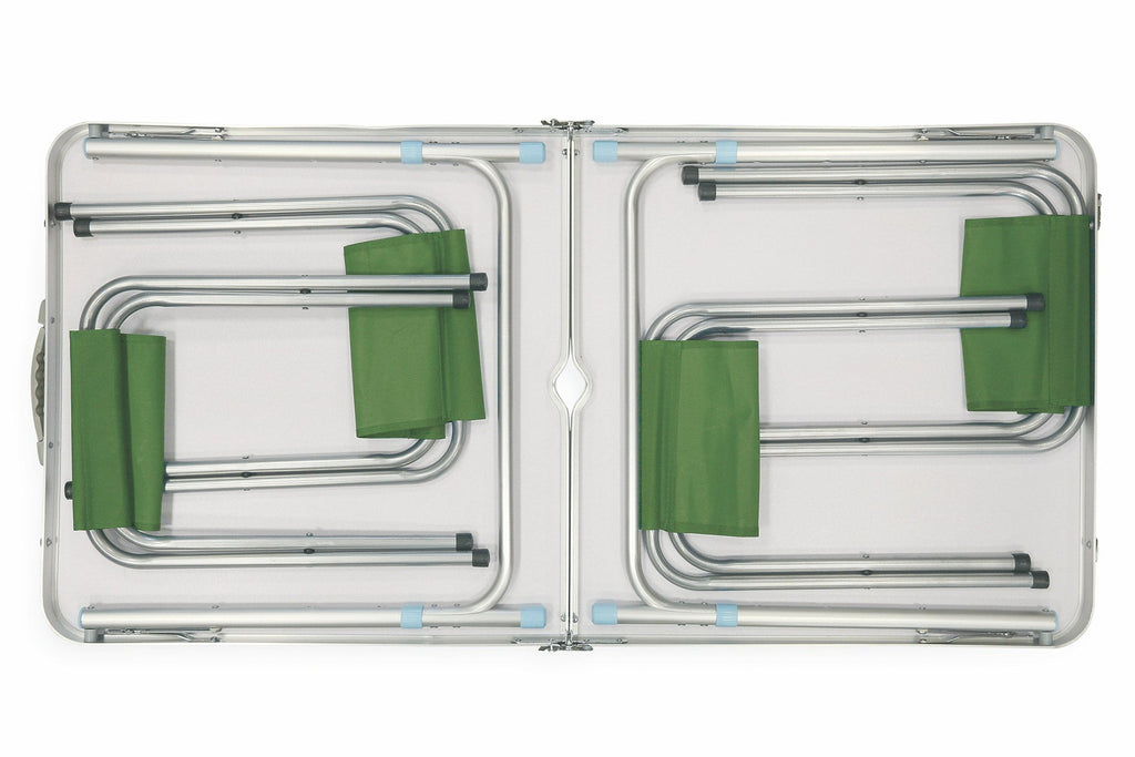 Perch è pratico e salvaspazio, perfetto da trasportare in spiaggia, in giardino, in campeggio. Un picnic tra amici o una gita fuoriporta non si trasformeranno più in sfiancanti sfacchinate. Tavolo e sgabelli possono essere trasportati in un'unica valigetta ultra leggera che una volta aperta si trasformerà in un tavolo spazioso abbastanza per contenere tutto l'occorrente. La struttura antiruggine è robusta e resistente, ma conserva una flessibilità adatta ad un utilizzo continuo.