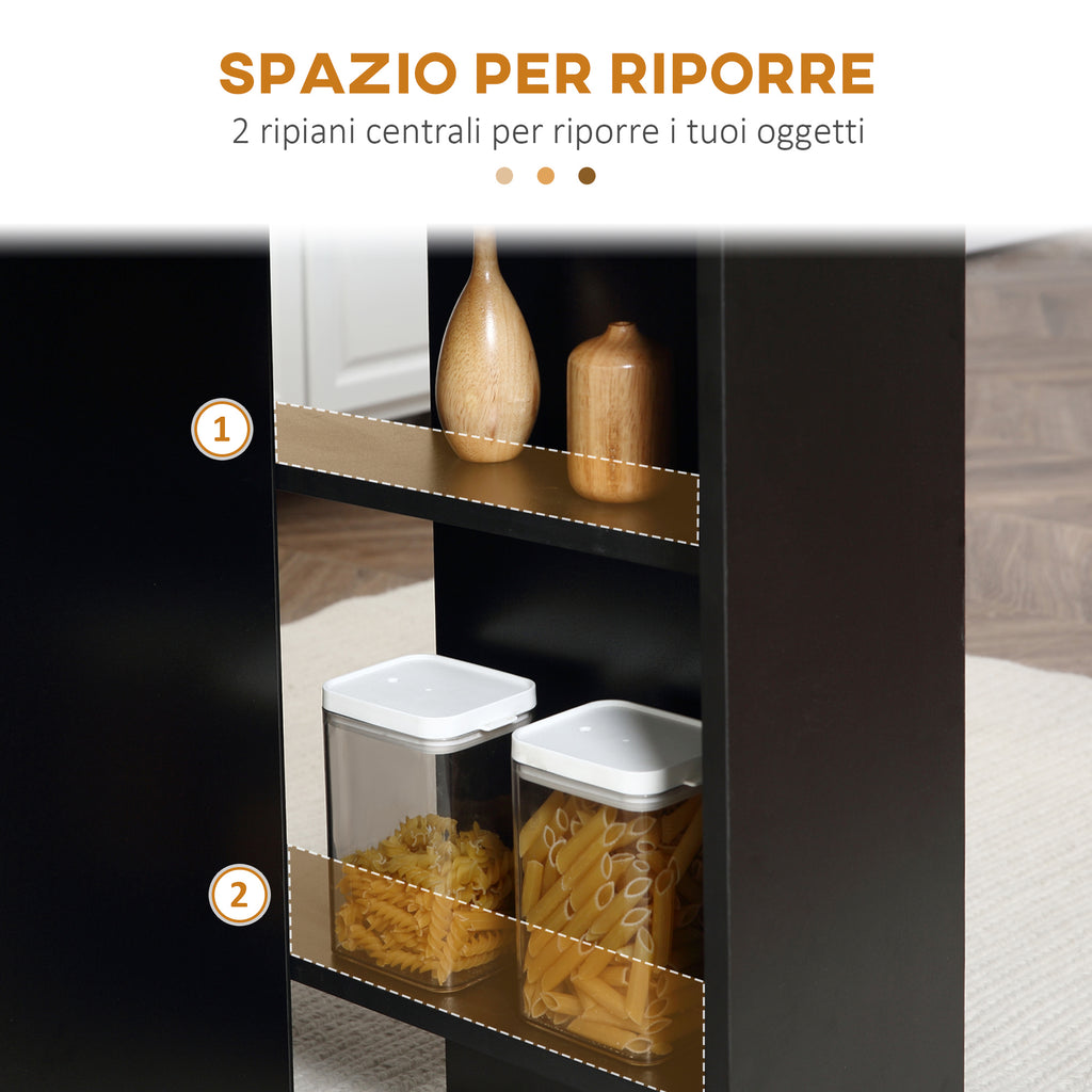 Questo tavolo pieghevole in legno può adattarsi a qualsiasi ambiente della tua casa. Quando è chiuso, ha l'aspetto di una consolle ma, una volta aperto, il tavolo rettangolare può ospitare fino a 4-6 presone. Sotto il piano d'appoggio sono presenti 2 pratici ripiani che offrono tanto spazio per riporre i tuoi oggetti. Le 2 ruote (di cui una con freno) permettono una maggiore mobilità: puoi infatti spostarlo ovunque e senza nessuna fatica.