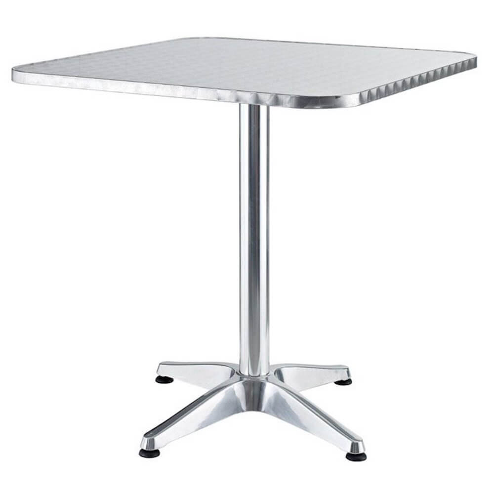 Tavolo quadrato in alluminio con piedini regolabili.