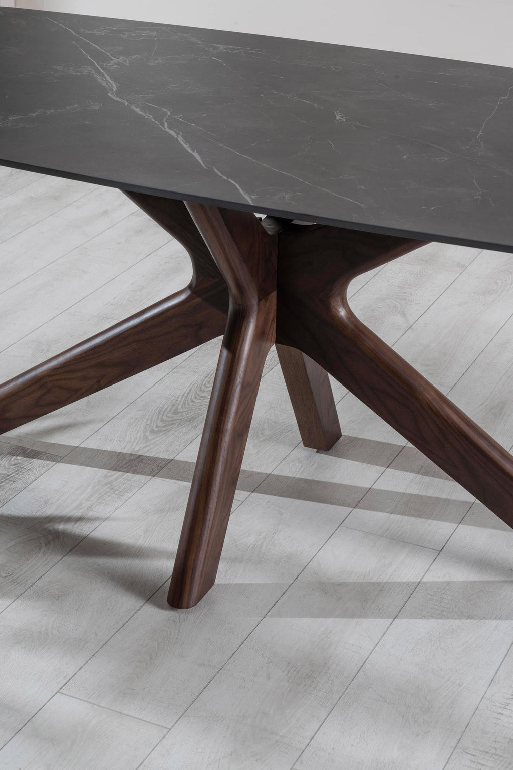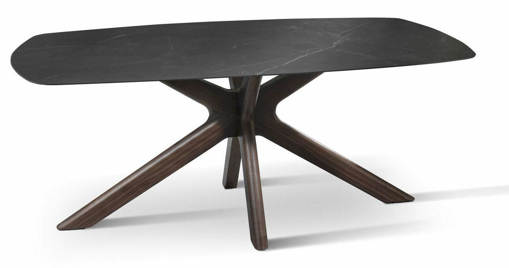Gemini è un tavolo raffinato e inedito, in cui linee fluide e morbide giocano tra loro creando dettagli di grande forza visiva. Sul basamento a forma di stella, realizzato in massello di noce, poggia delicatamente la piana in ceramica marmo alabastro lucido. La superfice lattata del tavolo Gemini, con venature trasparenti che vanno dal grigio all’arancione, dona eleganza e distinzione. Frutto di una ricerca che esplora gli stili e le ispirazioni più diverse, Gemini è un vero protagonista dell’area living, inserendosi armoniosamente sia negli ambienti dal design moderno, sia negli spazi che prediligono il lusso e lo stile classico. Ideale è l’abbinamento con le sedie rivestite in tessuto e struttura in massello di noce, come le sedie Vera e Astrid, che si sposano elegantemente con la graziosa base del tavolo.