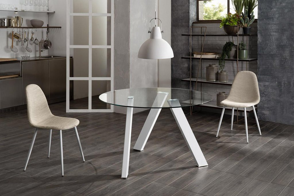 Tavolo tondo di design, perfetto per ogni spazio e grazie al top in vetro dona luce e leggerezza alla stanza.