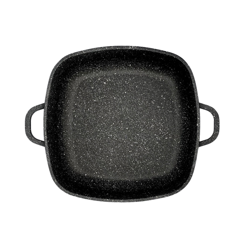 Tegame Quadro cm.28x28 in alluminio pressofuso con rivestimento antiaderente con coperchio vetro borosilicato. Forma alta e capiente,pomolo in bakelite di facile presa. La particolare forma quadrata alta e capiente è ideale per le lunghe cotture a fiamma medio bassa. Utilizzabile anche in forno (senza il coperchio). Bello da servire direttamente in tavola. diam. Cap.Lt. Altezza/Height cm. 28x 28 5.50 lt. 10.5 cm.