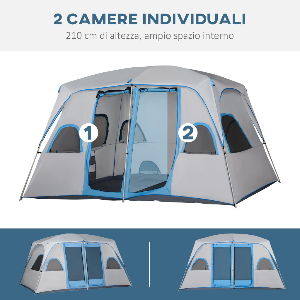 Parti all'avventura con la tenda da spiaggia ! Progettata per ospitare da 4 a 8 persone, ha ampie dimensioni interne che ti permettono di dividere l'ambiente in 2 stanze separate. Ha una resistenza all'acqua testata oltre 2000mm e il tessuto taffetà con rivestimento in PU anti UV protegge efficacemente dal sole. La struttura in acciaio con pali flessibili in fibra di vetro e i picchetti e corde inclusi garantiscono una stabilità ottimale.