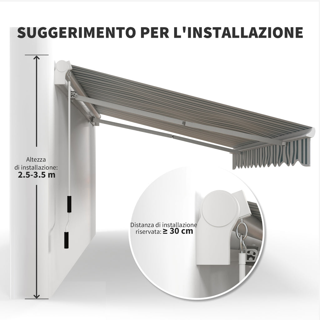 Proteggi la tua casa con la tenda da sole a bracci! Ha una solida struttura in metallo e alluminio e una copertura parasole in poliestere impermeabile, che garantiscono resistenza e lunga durata. Si monta facilmente al muro grazie agli accessori inclusi e si apre e chiude facilmente con la manovella integrata. Goditi le giornate all'aperto proteggendoti efficacemente dal sole con la nostra tenda da sole avvolgibile.