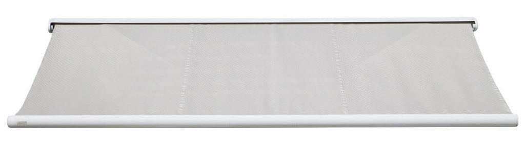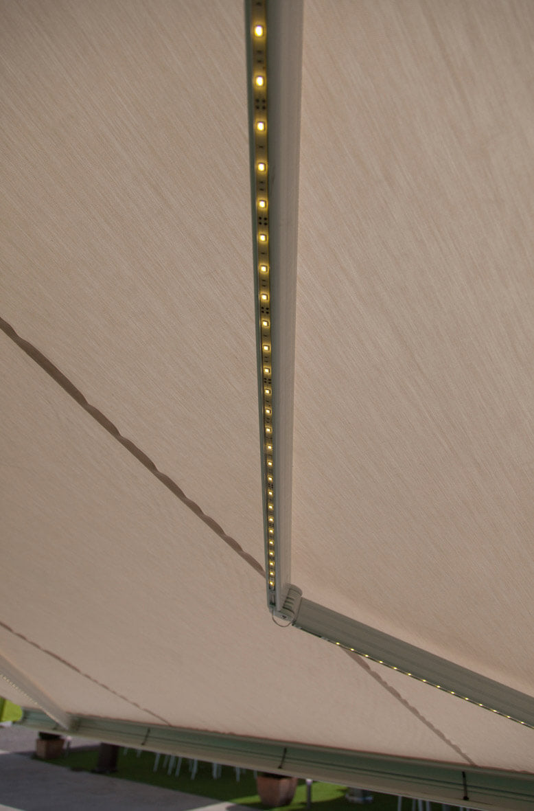 Tenda da esterno con cassetto per incasso e barra frontale che garantisce la chiusura totale della tenda. Dotata di motore e telecomando. Tessuto in acrilico ecru 280 g, protezione UV80, trattamento anti-pioggia e struttura bianca in alluminio con luce a LED.
