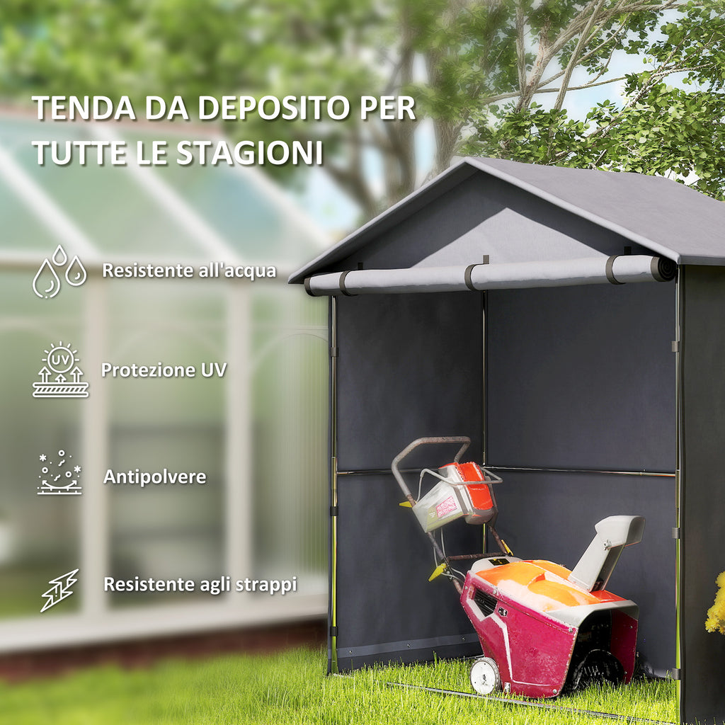 Tieni le tue bici e attrezzi da giardinaggio al riparo nel capanno da giardino. Realizzato in resistente tessuto Oxford 420D, questo capanno portatile assicura che i tuoi oggetti siano al sicuro da vento leggero, pioggia e sole. L'ampia porta con zip favorisce il flusso d'aria e l'accesso allo spazio interno, mentre il robusto telaio in acciaio zincato resiste alla ruggine e all'usura. La scelta perfetta per uno spazio esterno sempre ordinato!