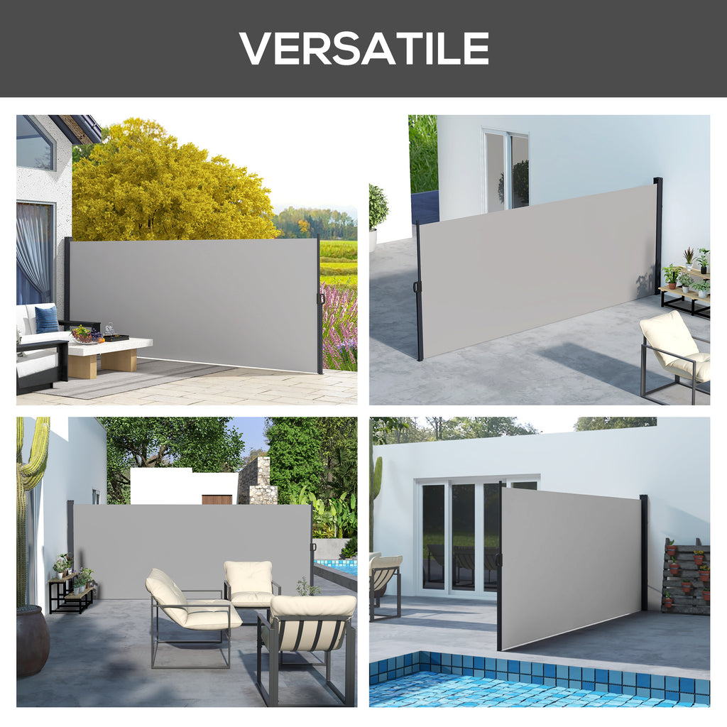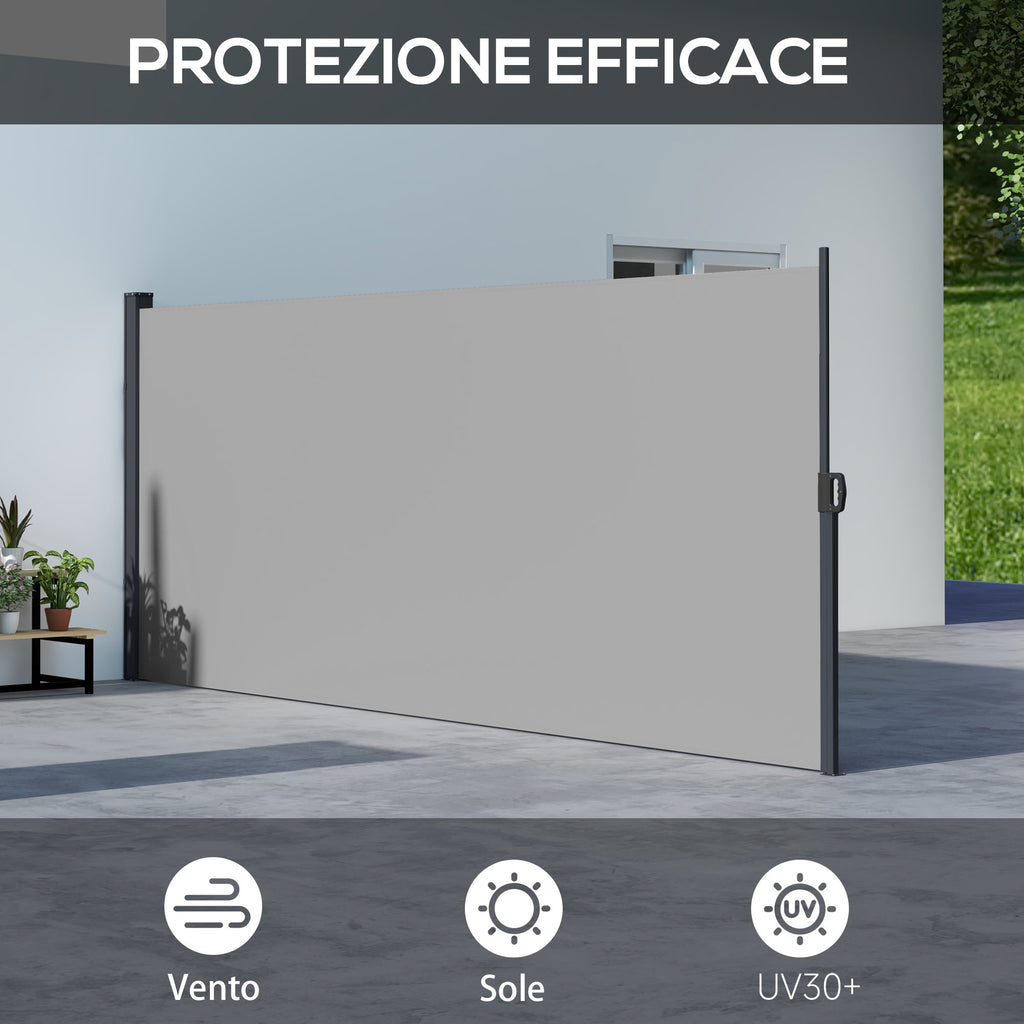 Ottimizza il tuo spazio all'aperto con la tenda laterale e goditi una giusta privacy esterna. La struttura in metallo robusto è ideale per schermare dai raggi solari intensi e dalle raffiche di vento, ancorandosi facilmente e fermamente a cemento o legno massiccio. Facile da dispiegare e bloccare grazie alla maniglia integrata, la quale assicura un uso semplice e pratico. Frangivista da giardino rinforzato per ripararti dal vento e dagli sguardi indiscreti. La tenda retrattile con maniglia ti permetterà di dispiegarla o arrotolarla automaticamente senza sforzo in pochi secondi. Tenda laterale esterna grigia in grado di adattarsi a spazi esterni di varie dimensioni. Frangivista da esterno avvolgibile realizzato in poliestere anti-UV (UV 30 +) ad alta densità 180 g/mq impermeabile e resistente alle intemperie. Struttura in alluminio di alta qualità e telaio in metallo epossidico. Fissare un lato a un muro e l'altro lato al cemento, al pavimento in cemento o alla terrazza in legno per ottenere una maggiore stabilità.