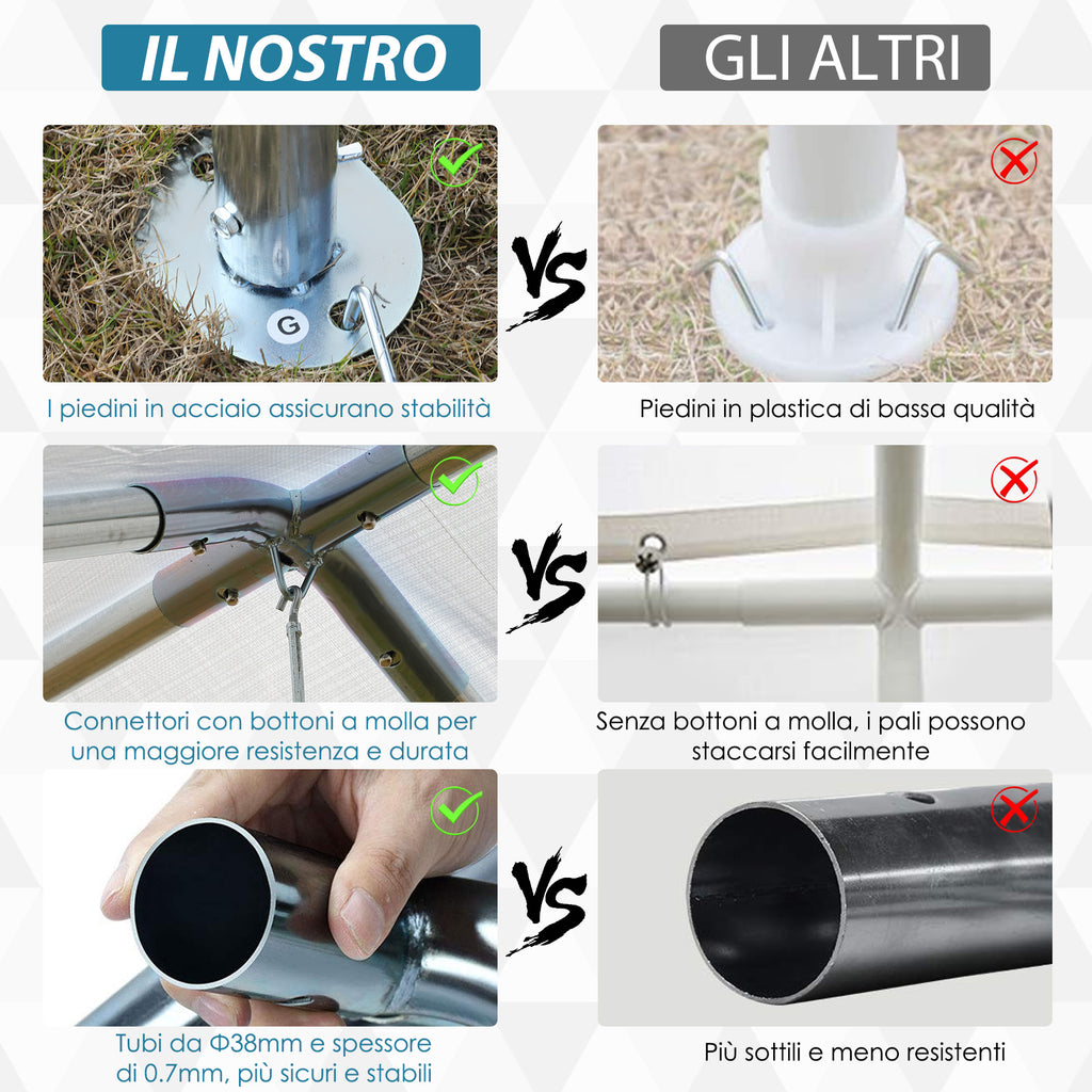 - ACCESSORI INCLUSI: Include i picchetti e le corde di ancoraggio a terra, per dare un supporto extra alla struttura e tenere il tendone teso in modo da far defluire l'acqua piovana.