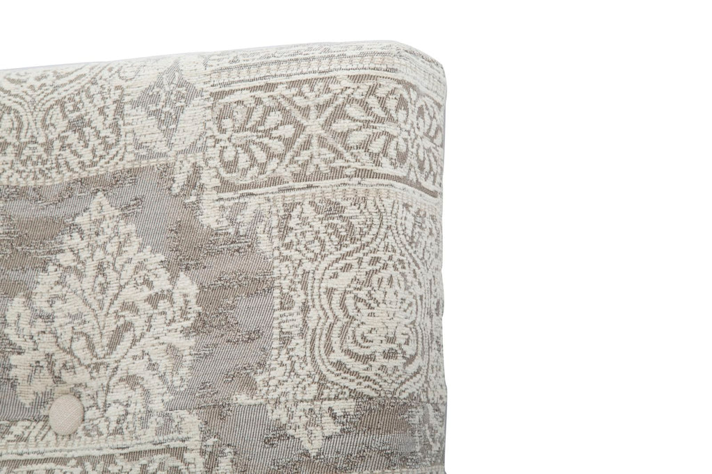 Testiera da letto in legno e tessuto imbottito. La linea Damasco ricorda i pizzi e le ceramiche inglesi. Colori tortora e crema ricreano un'atmosfera fiabesca, da moderna casa delle bambole. Un delicato gusto shabby capace di impreziosire finemente ogni ambiente.