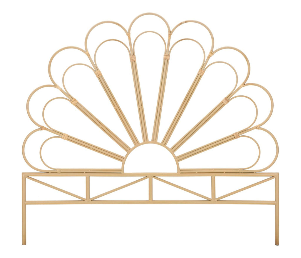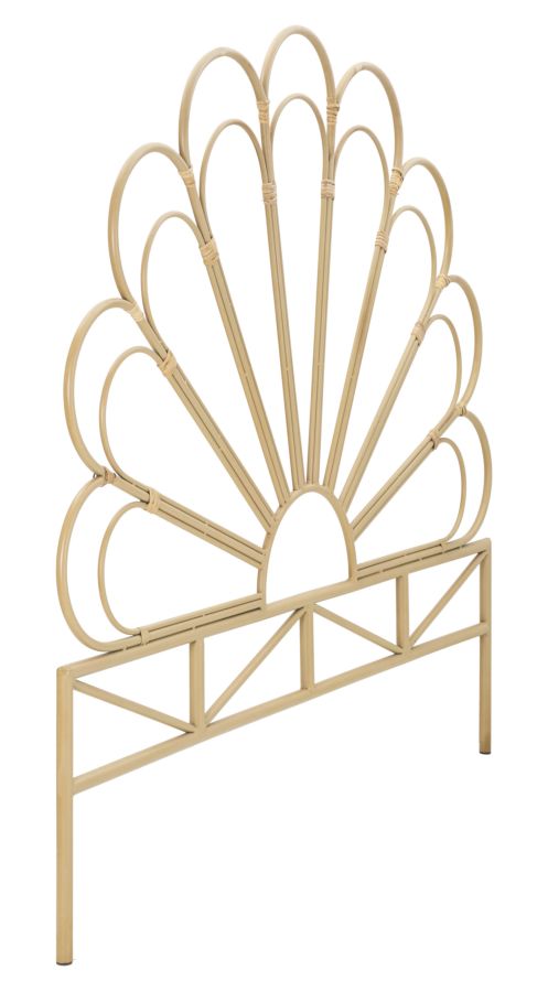 La testiera per letto proposta è realizzata in metallo resistente e presenta finiture in rattan che aggiungono un tocco di natura e calore all'ambiente. Il design arrotondato e le linee morbide richiamano elegantemente i petali di un fiore, conferendo un aspetto delicato e raffinato al letto. Questa testiera è perfetta per aggiungere un tocco di stile sofisticato e romantico alla camera da letto.