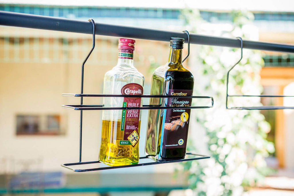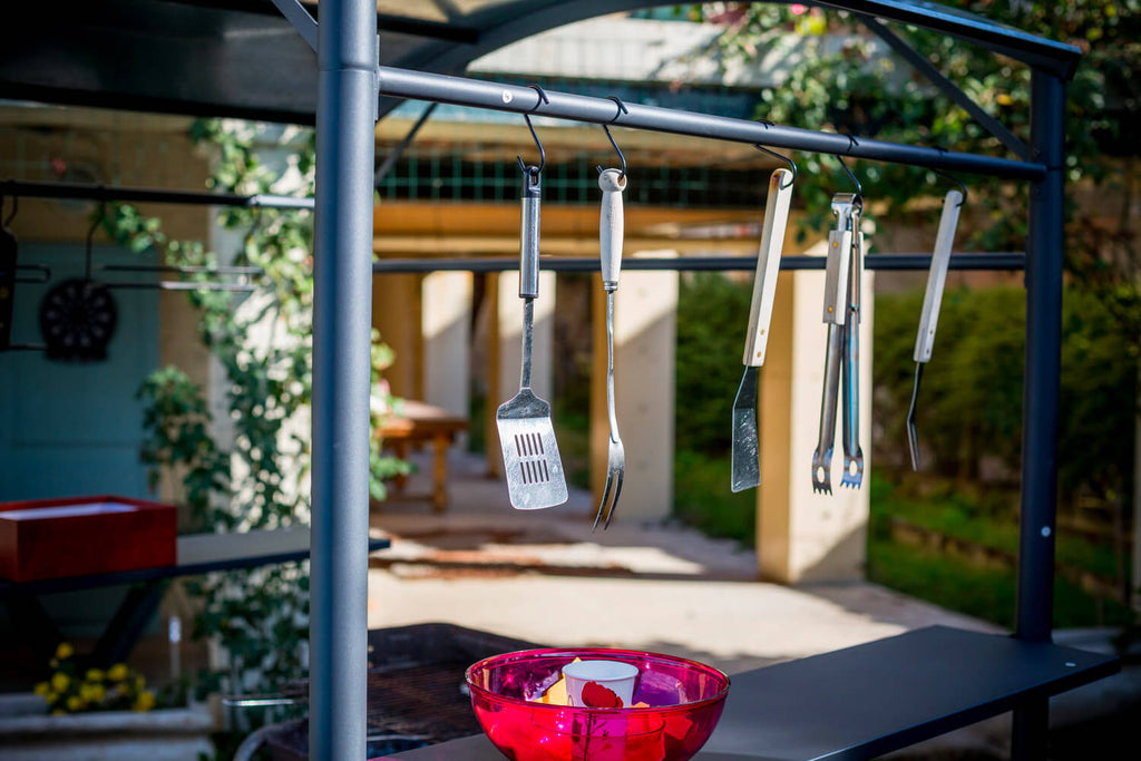 - Viene fornito con una mensola 34x7x20,8 cm porta-condimenti, un ripiano porta ascigatutto carta da 35x8x31,6 cm, un grembiule da cucina appendiabiti, 5 ganci per accessori cottura, un porta sacco della spazzatura da appendere a fianco del barbecue