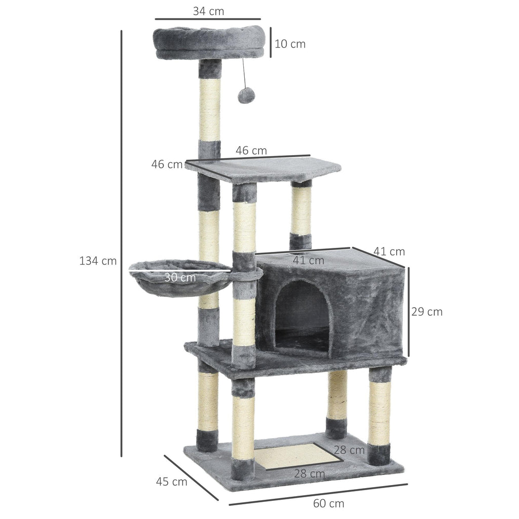Tiragraffi con Cuccia e Cestino sospeso per Gatti 60x45x134 cm in Peluche Sisal Grigio