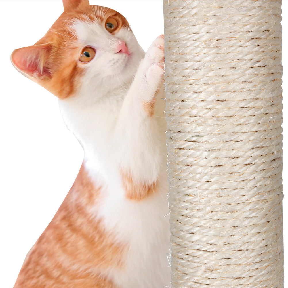 Il robusto sisal è attorcigliato attorno al grande palo, sul quale il gatto può affilare le unghie.