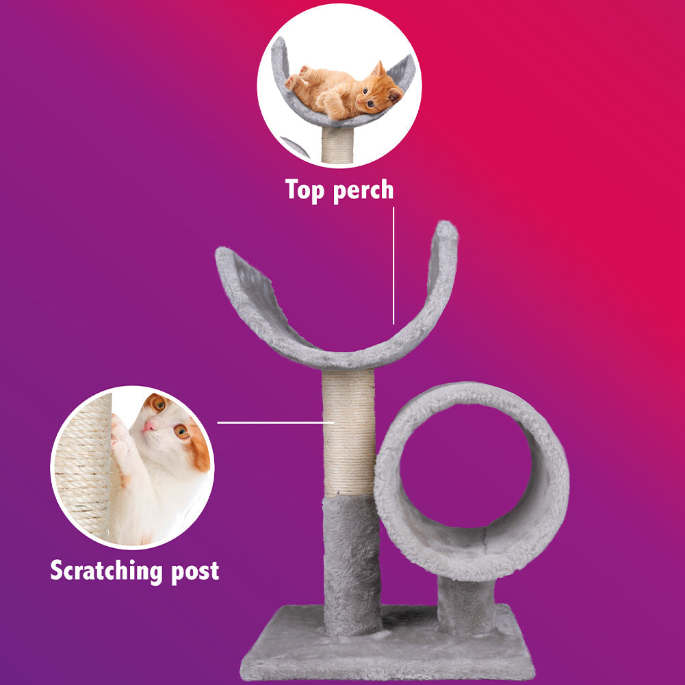 Ci sono 2 pali sulla piattaforma di peluche inferiore, 1 grande e 1 più piccolo. Quello più grande ha sisal per graffiare. Sul palo c'è un semicerchio di morbido peluche su cui il tuo gatto può sdraiarsi, sedersi o stare in equilibrio in tutti i modi meravigliosi. Sul palo più piccolo è montato un tunnel di peluche in cui il gatto può nascondersi dagli altri gatti o fare un sonnellino beato.