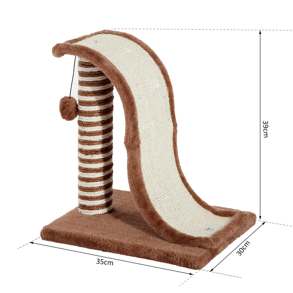 Composto da una colonna in sisal, uno scivolo a forma di S in morbido velluto e una pallina appesa ad una corda.