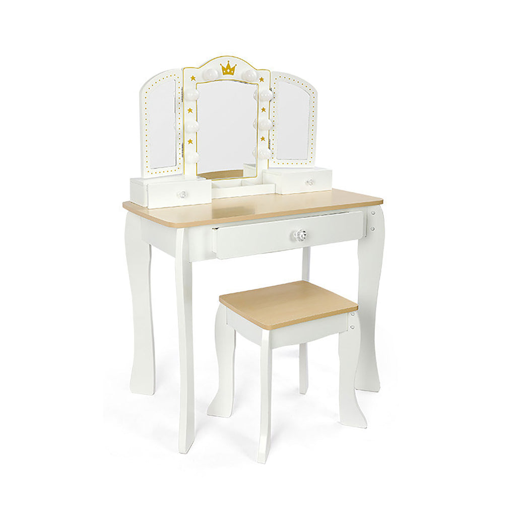 Porta un tocco di magia alla cameretta con il set da trucco per le tue bambine! Il set include un tavolo da trucco elegante con specchio centrale, luci a LED e 2 cassetti per riporre i tuoi oggetti preferiti e uno sgabello da trucco coordinato. Perfetto per bambine dai 3 ai 6 anni.