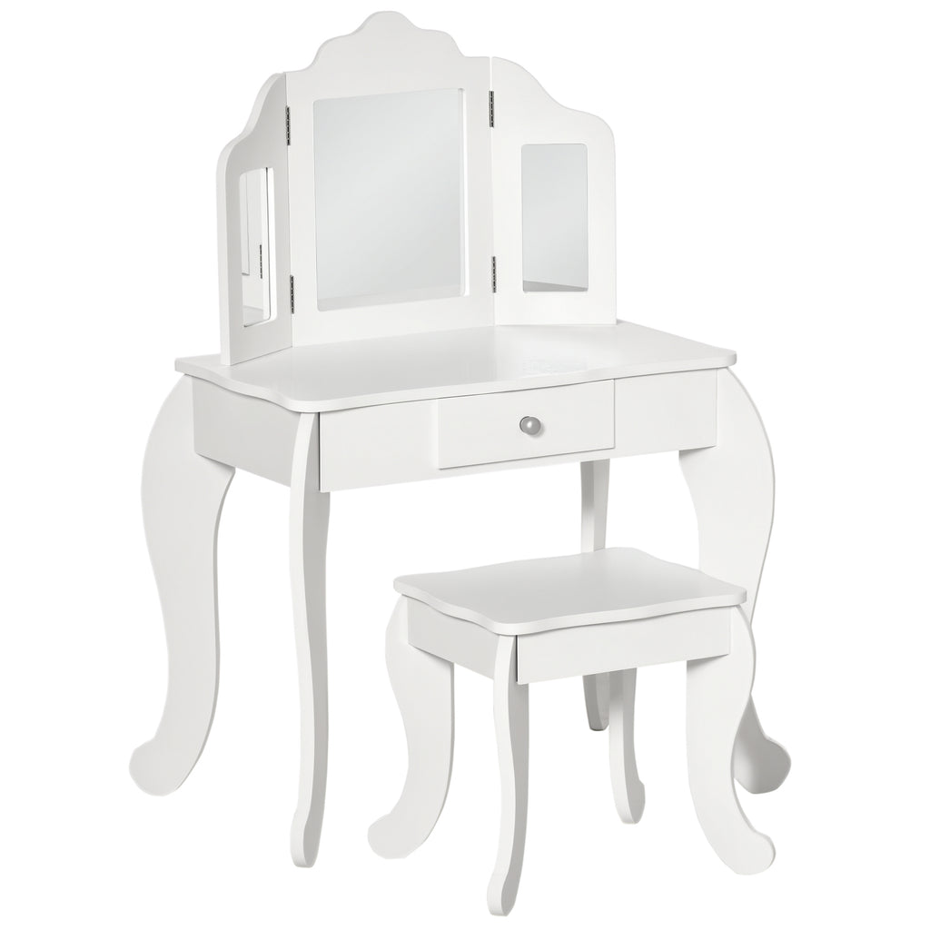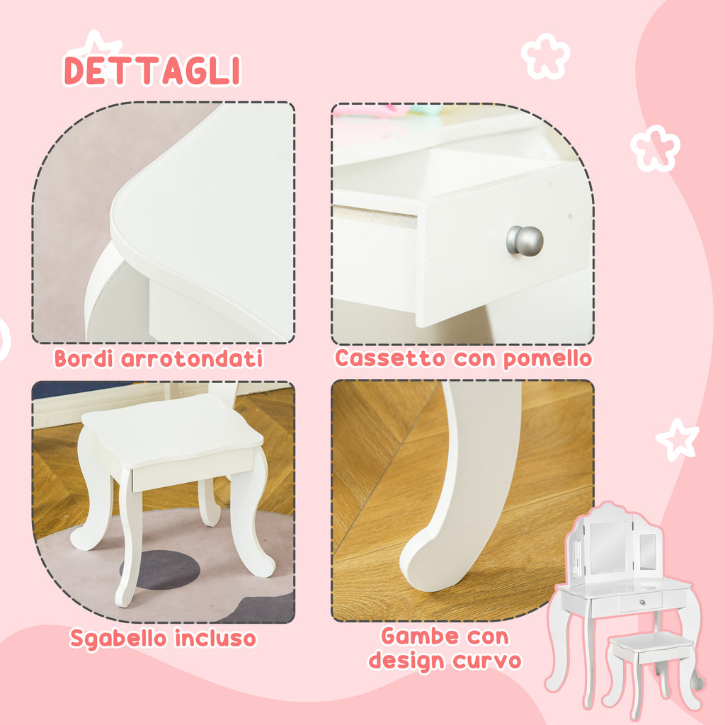 Toeletta Trucco per Bambine Consolle e Sgabello 63x40x85,5 cm con Triplo Specchio in Legno e Acrilico Bianco