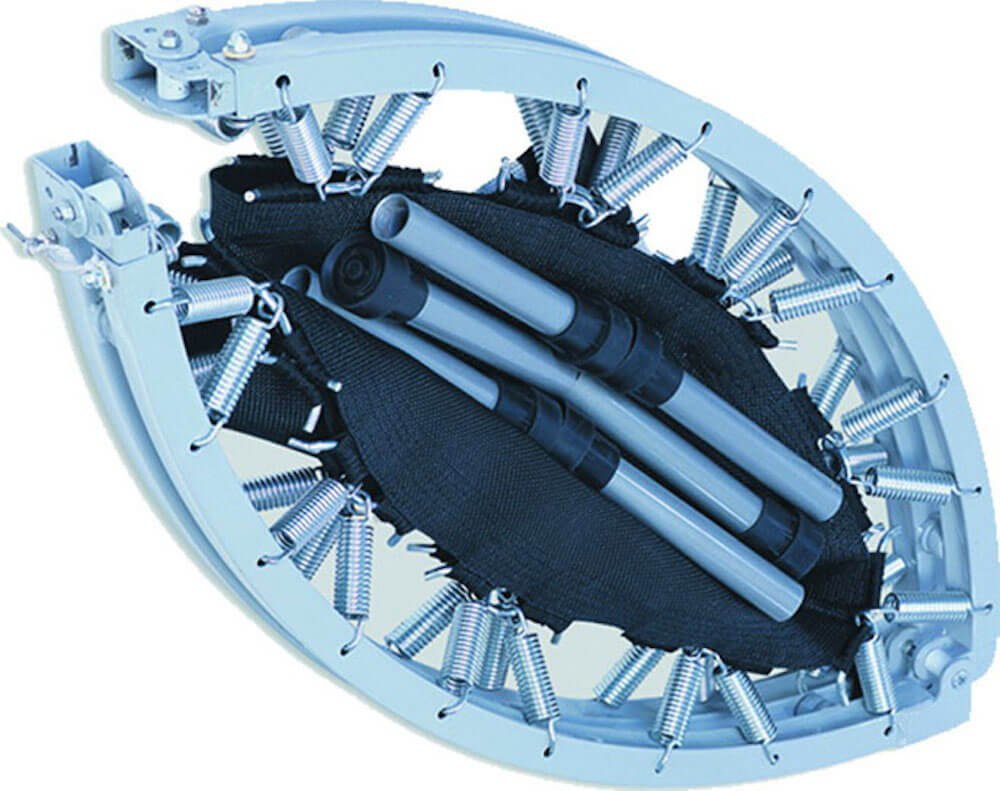 Tappeto: polipropilene Permatron, prodotto negli Stati Uniti, resistente UV, colore: nero. Il telo è unito alle molle da una serie di anelli a V rivestiti in tessuto a numerose file di punti.