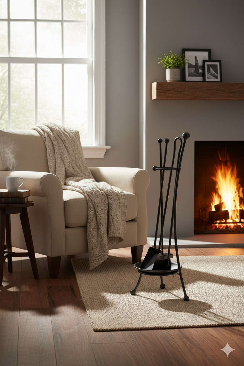 Trespolo per Attrezzi Camino a Bacinella con Paletta Scopino Attizzino e Pinza 22x22x65 cm in Ferro Verniciato Grigio Martellato