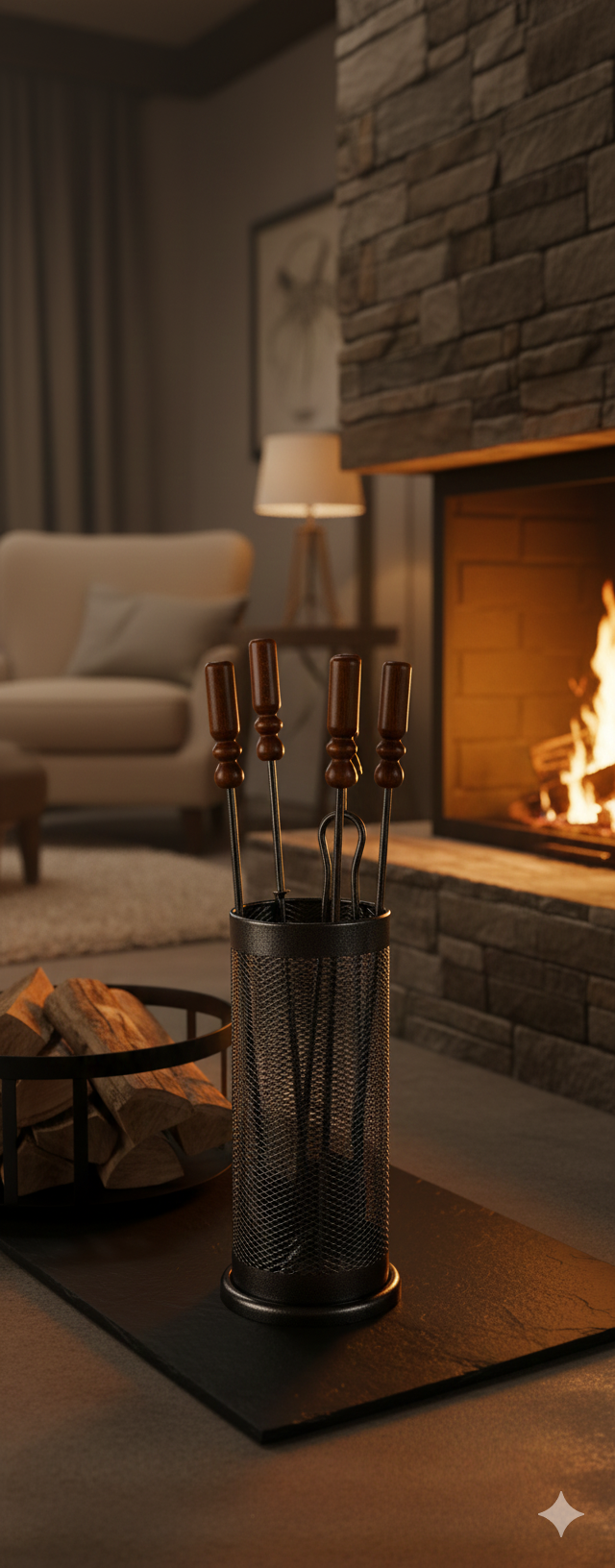Trespolo realizzato in ferro cilindrico design a reticolo, verniciato colore grigio martellato, costituito da 4 elementi (paletta, scopino, attizzino, pinza), con manici sagomati in legno, Made in Italy, facile da pulire con un panno umido, montaggio non richiesto.