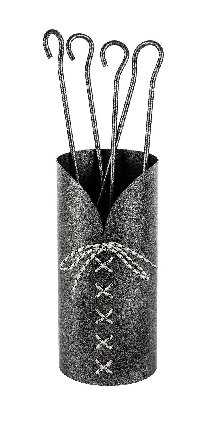 Trespolo per Attrezzi Camino Cilindrico Laccio con Paletta Scopino Attizzino e Pinza Ø15,2x62 cm in Ferro Verniciato Grigio Martellato - La Ferrotecnica
