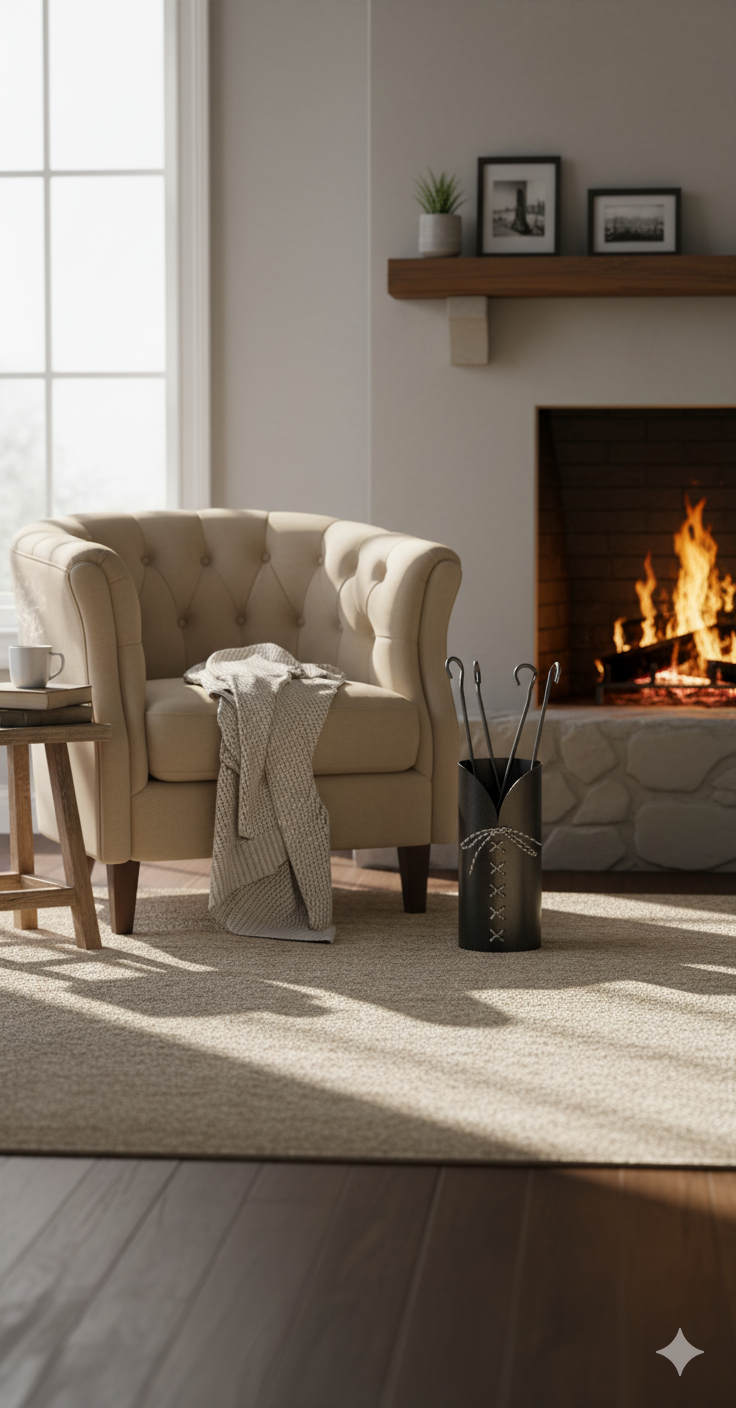Trespolo per Attrezzi Camino Cilindrico Laccio con Paletta Scopino Attizzino e Pinza Ø15,2x62 cm in Ferro Verniciato Grigio Martellato