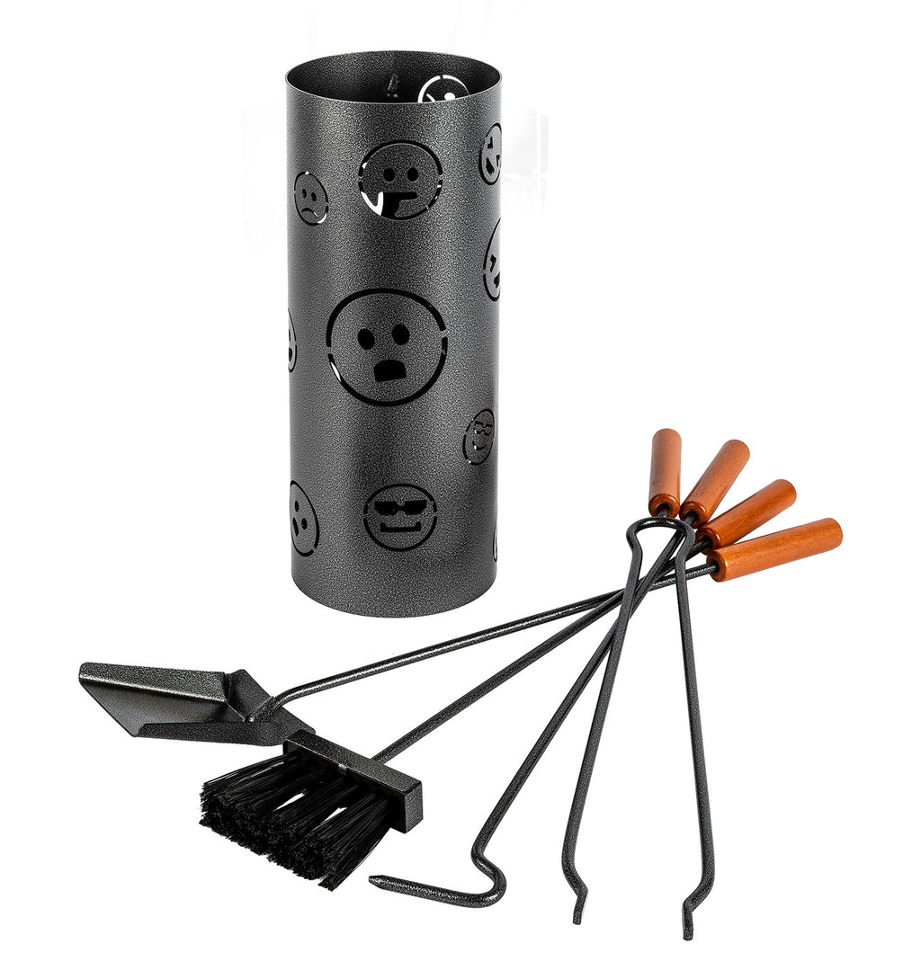 Trespolo per Attrezzi Camino Cilindrico Sagoma Faccine con Paletta Scopino Attizzino e Pinza Ø15,2x62 cm in Ferro Verniciato Grigio Martellato