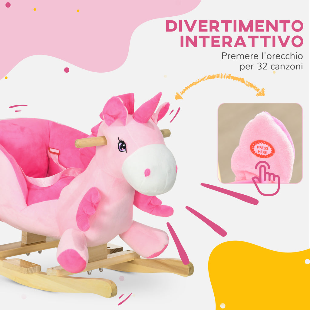 Unicorno a Dondolo Cavalcabile Peluche con 32 Canzoni 65x35x45 cm con Cintura di Sicurezza Rosa