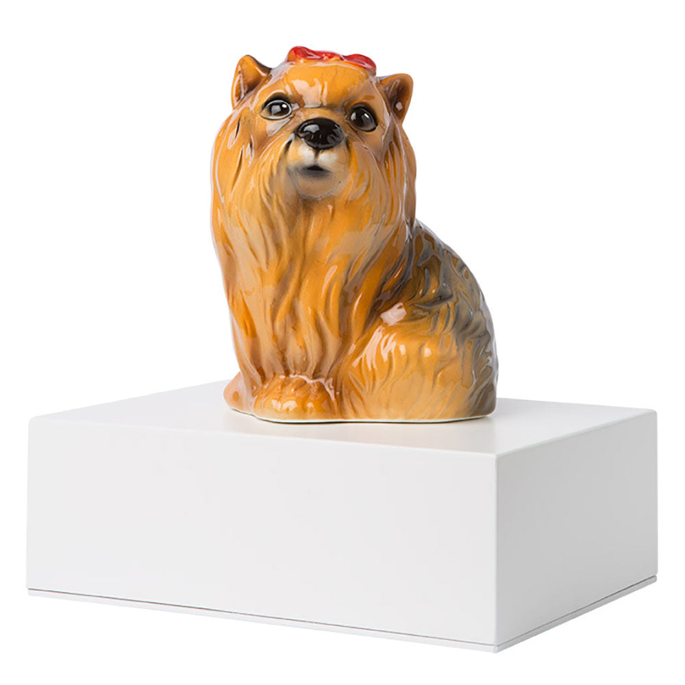 Urna cineraria in legno laccato bianco. Le misure del prodotto: larghezza 20 cm profondità 15 cm ed altezza 10 cm. La capienza volumetrica di questo prodotto è di circa 2,5 L, adatta ovvero ad animali che hanno un peso oltre i 40 kg. La miniatura in ceramica di uno Yorkshire Terrier è alta circa 15 cm ed è dipinta a mano. Chiusura con viti.