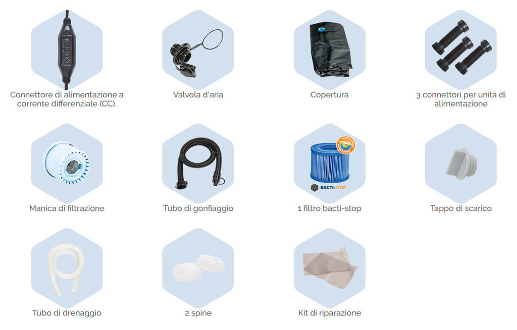 - Gli ugelli massaggianti dispersi a 360° abbinati ad un potente soffiatore da 650W assicurano l'omogenea e piacevole cura delle bolle di massaggio. L'unità motore riscalda rapidamente anche l'acqua della piscina fino a 42°C per godersi i piaceri della spa tutto l'anno!