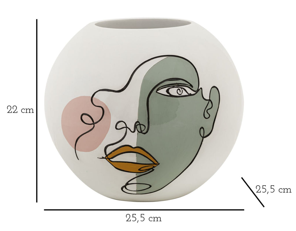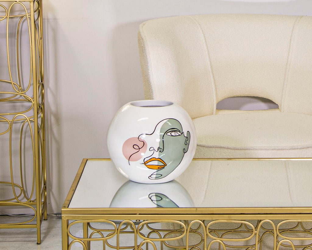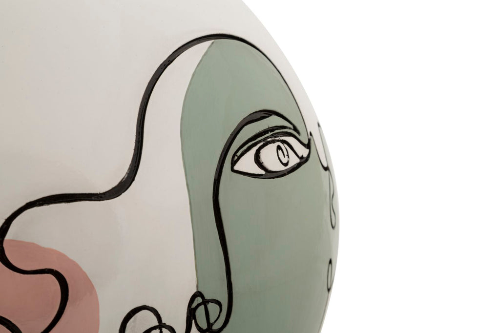 Questo vaso rotondo, dalla finitura raffinata, è un'opera d'arte arricchita da un volto di design astratto. La sua forma elegante e armoniosa cattura l'attenzione dell'osservatore, mentre la decorazione dettagliata del volto aggiunge un tocco di mistero e fascino. La combinazione di elementi astratti e realistici crea un'atmosfera unica, rendendo questo vaso un pezzo affascinante e irresistibile per gli amanti dell'arte.