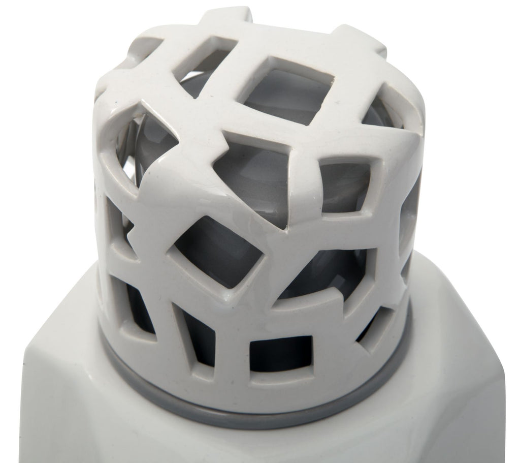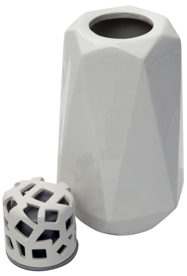 Vaso in ceramica bianca intagliata con interno nero e coperchio. La ceramica si avvolge in linee sinuose e accattivanti per incorniciare i fiori più belli. Vasi che diventano veri e propri oggetti di design da collezionare.