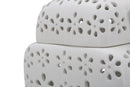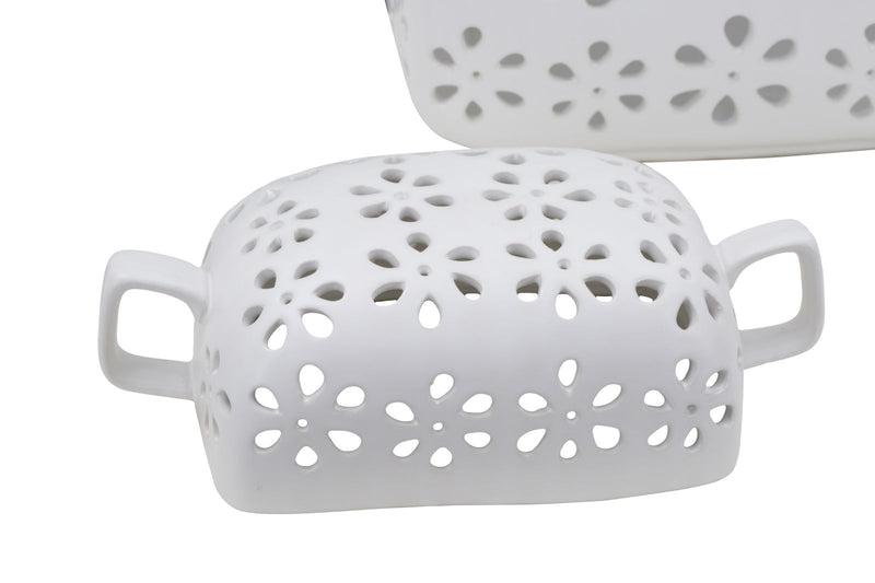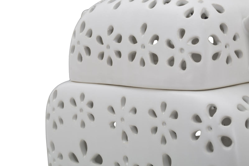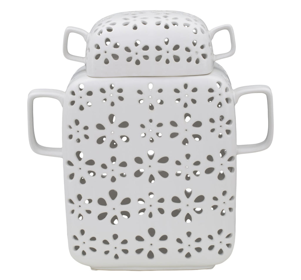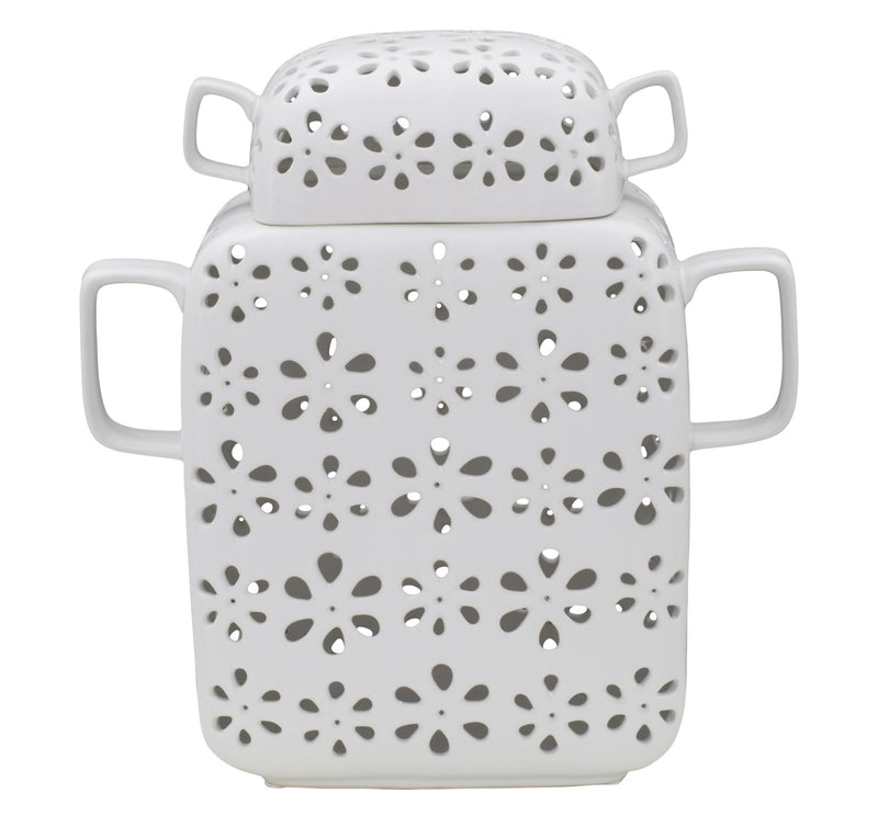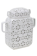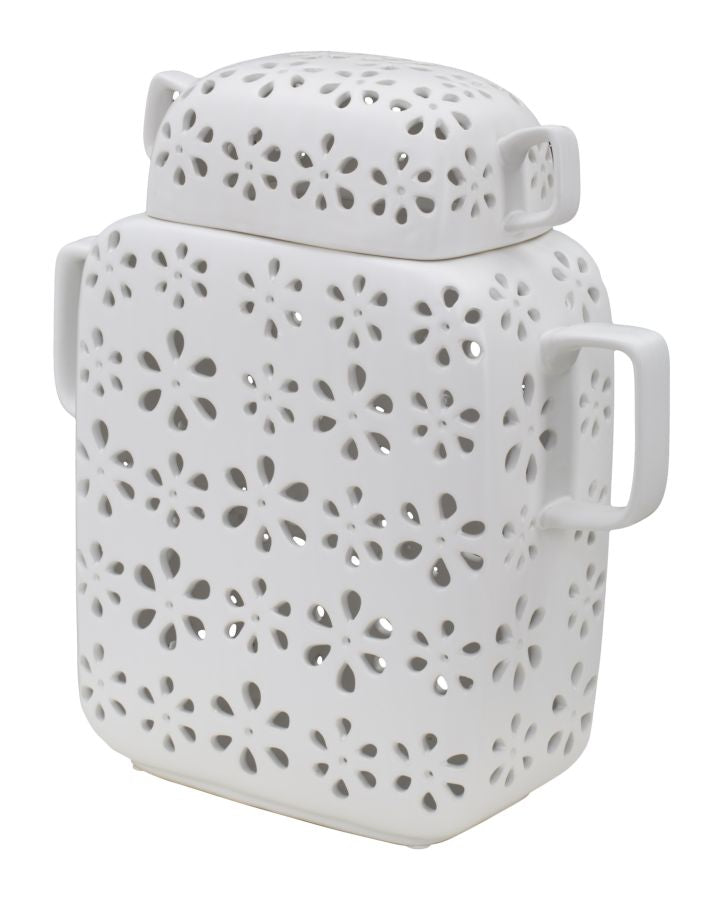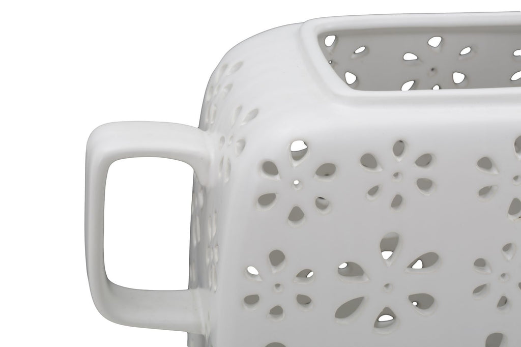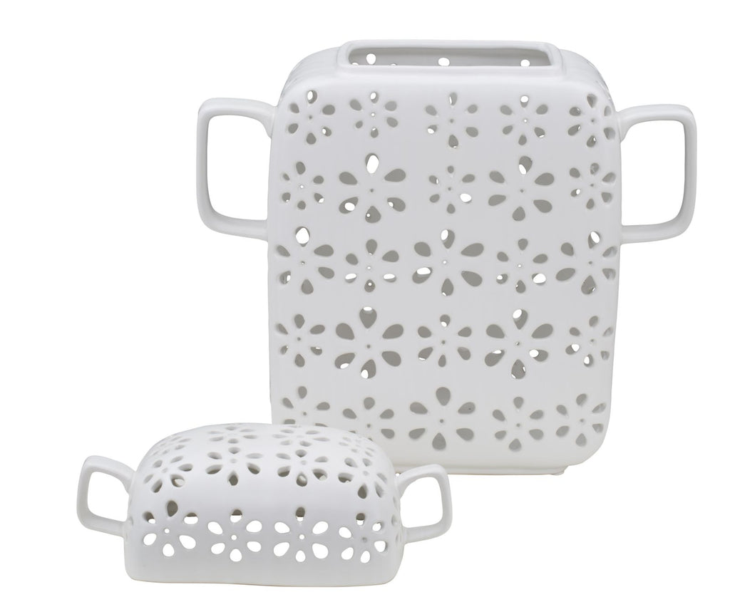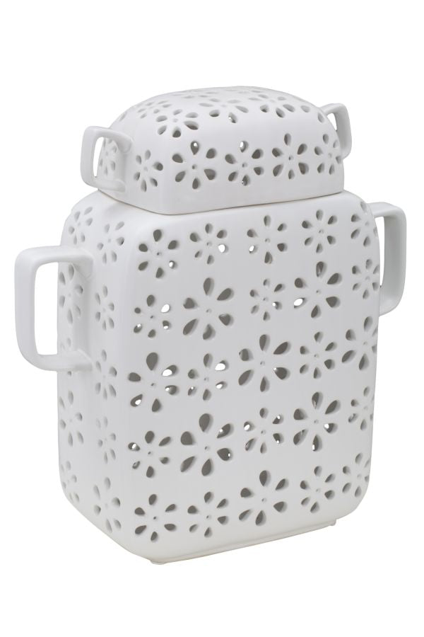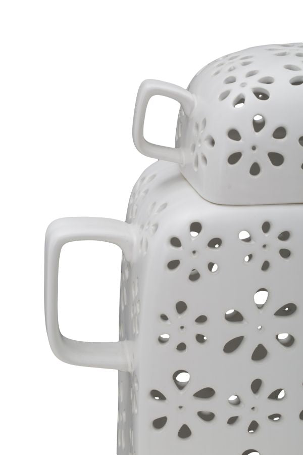 Vaso in porcellana bianca con intarsi e coperchio. La porcellana si avvolge in linee sinuose e accattivanti per incorniciare i fiori più belli.Vasi che diventano veri e propri oggetti di design da collezionare.