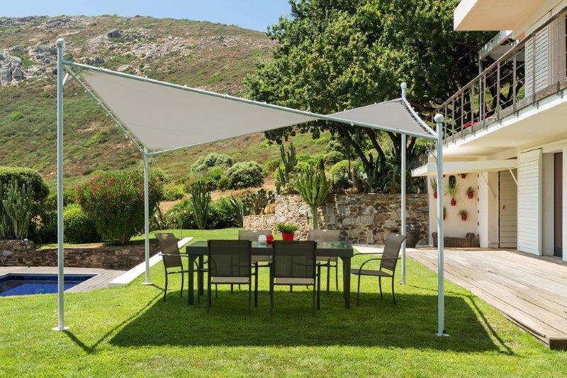 Vela Gazebo da Giardino, in ferro verniciato a polvere epossidica di colore rugine, 4 pali verticali diam. 56mm, tessuto in poliestere e PVC 180g/m2 idrorepellente di colore ecrù. Prodotto da Assemblare. Dimensioni: 400 x 400 cm.