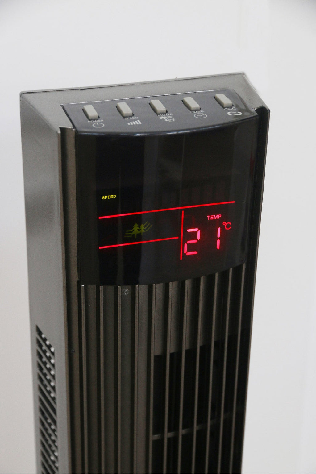 trasportabilità. caratterizzato da 3 velocità, 3 funzioni di ventilazione e un timer programmabile, che si attivano sia da telecomando sia da pannello di controllo, posto sulla parte superiore del ventilatore. Il pratico display lcd vi aiuterà a tenere sotto controllo la temperatura e l'impostazione di tutte le funzioni.