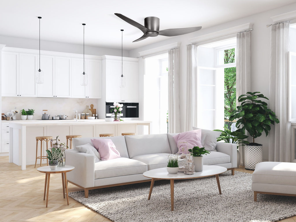 Ventilatore da soffitto Flush colore Bianco Ventilatore con alloggiamento motore in acciaio con protezione antirumore e 3 pale in ABS. Diametro 127 cm Luce LED SMD 15W Tricolor. Ventilatore con rotazione reversibile Motore da 60W a 3 velocità Regolatore da parete e telecomando inclusi.