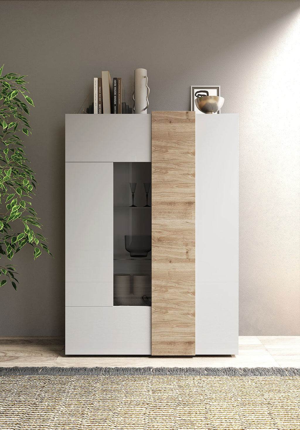 Vetrina Mobile Soggiorno Alto 2 Ante Senza Luci Venus 121x44x169 cm Bianco Lucido E Cadiz