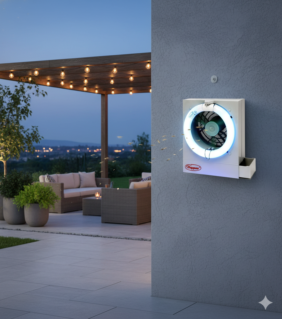 Una speciale lampada attinica, da 22 watt, attira gli insetti volanti (mosche, zanzare, vespe, moscerini, tarme, ... ecc.) ed un geniale sistema di turboaspirazione ad elica fosforescente a profilo assio-radiale li aspira convogliandoli in un cassetto estraibile, dal quale non potranno più uscire, dove moriranno per disidratazione. Periodicamente si svuota il contenuto come si farebbe con un portacenere.